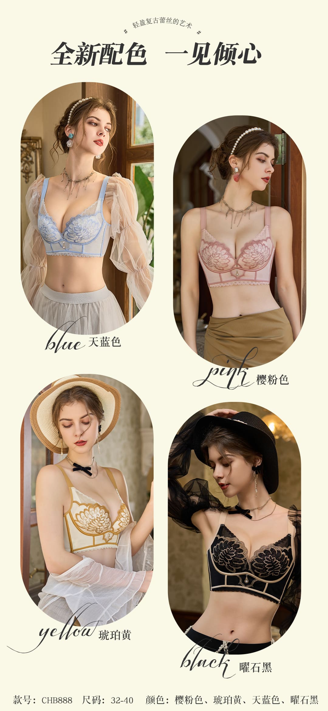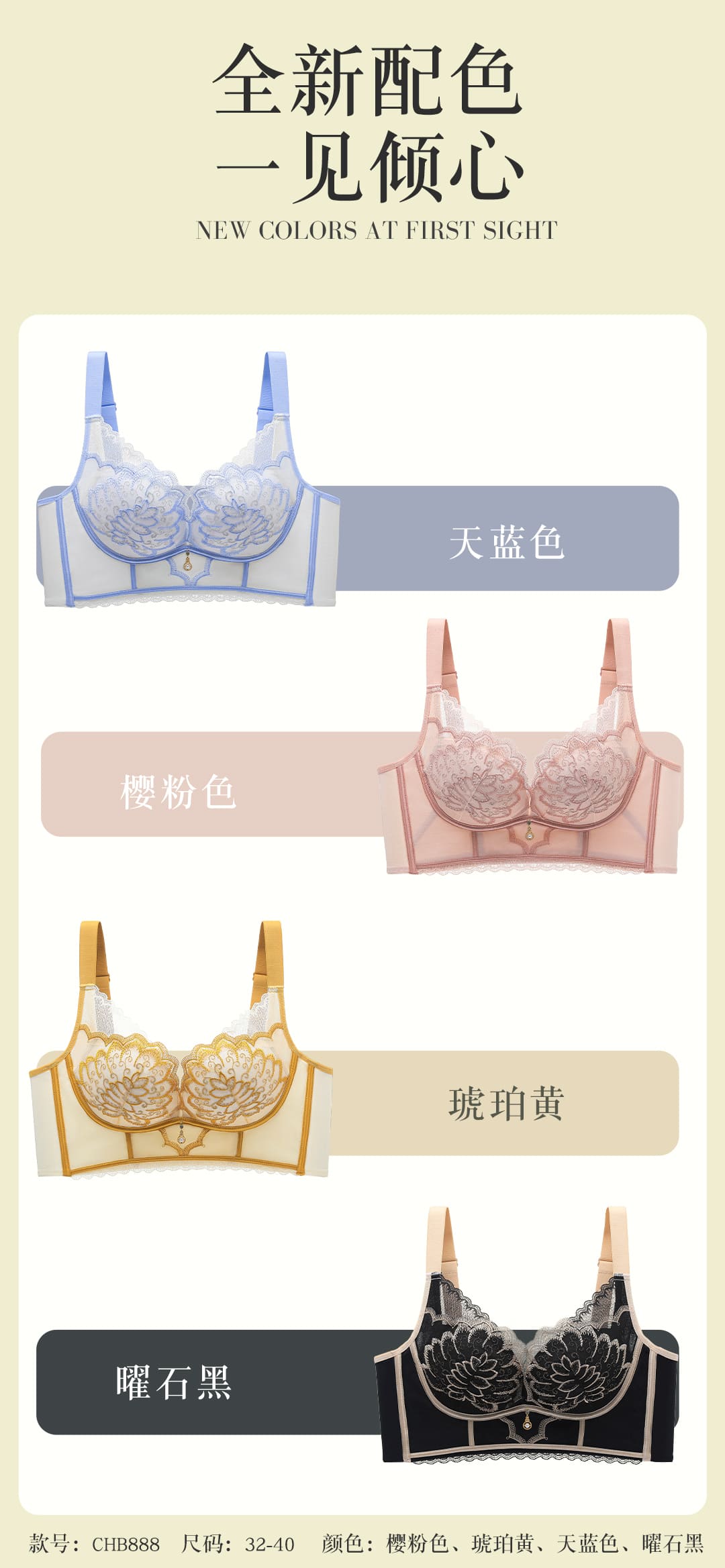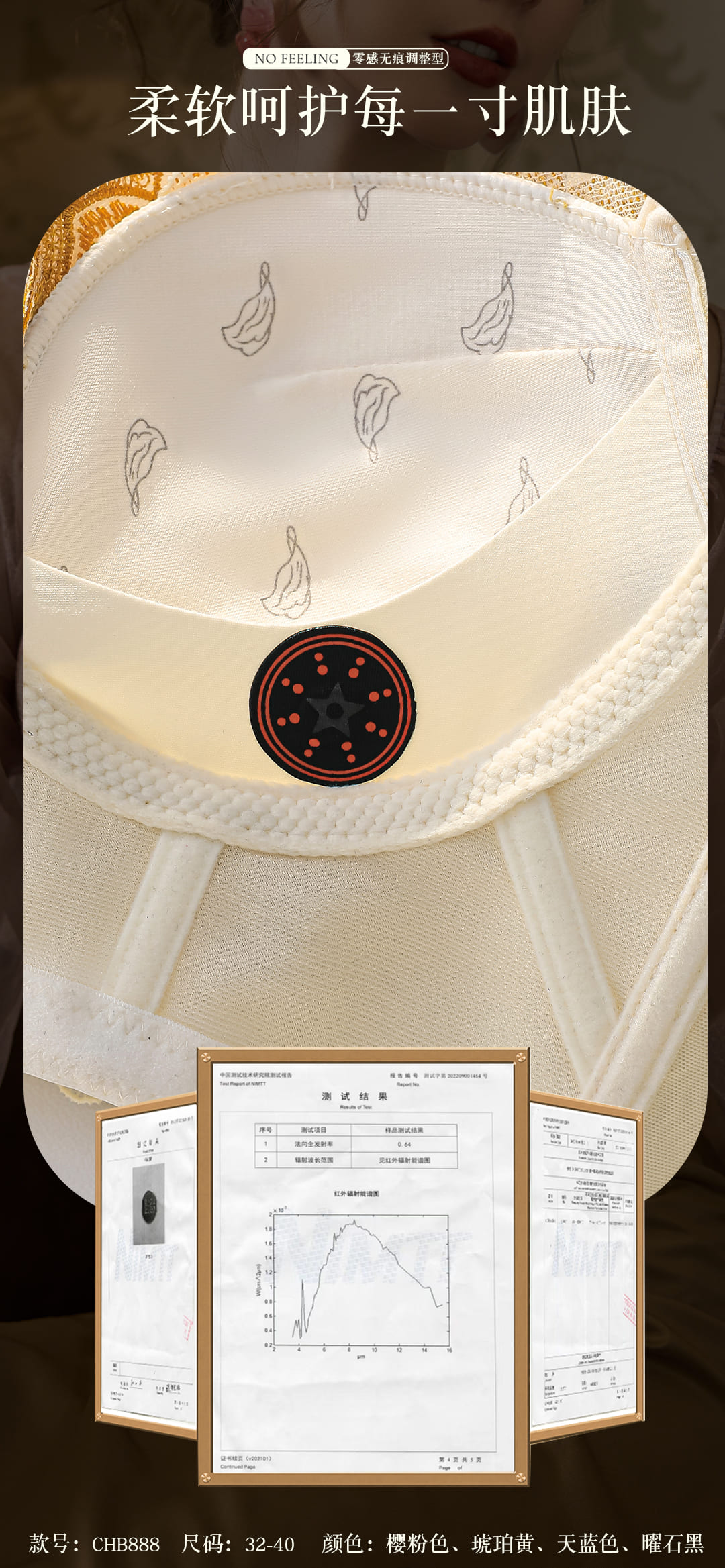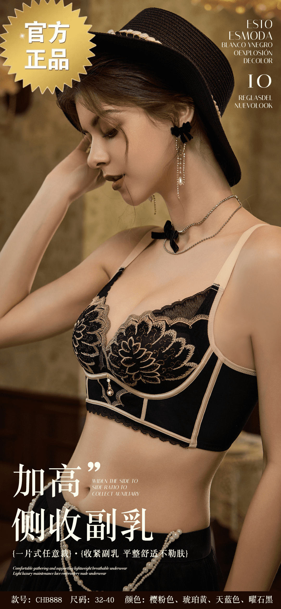 【品名】金仙子 【款号】CHB888 【颜色】樱粉色、琥珀黄、天蓝色、曜石黑 【尺码】32-40 美貌完全在线的刺绣丝覆盖 满满是少女气息高品丝手感巨好完全不扎肉纯欲诱人正当时整个面料是这种立体浮雕感唯美花朵精致立体,超灵动,视觉唯美性感,妥妥拿捏住的轻奢感对内衣的选择绝对的舒适度高于一切面料敲及软糯好像把云朵穿在了身上 🌿 燕窝纤维微磁场美白护肤养塑文胸 燕窝酸促进乳房表皮新陈代谢,让乳房光滑细嫩美白,磁石可刺激穴位,促进人体循环,提升免疫。 外观精致的蕾丝杯面~年轻时尚,修饰胸部比例。内里月牙形承托里布,轻轻一穿就能穿出迷人事业线。 上身聚拢,弹性优良贴身舒适超透气 清爽不闷热,无钢圈设计,稳固承托不勒胸,穿着无束缚。一秒沦陷进它的温柔包容里无法自拔 细腻柔美的刺绣加上精美的色纱点缀防下垂调整胸部曲线更好聚拢胸型塑造迷人美脑尽显青春活力 浪漫法式精致感的内衣长这样~ 不仅性感,舒适度也很OK!虽然是无钢圈款,但承托力是有的,不塌胸型好看又有实力~~ 后比四排四扣弹力肩带提拉上托胸型调节肩带分散肩部压力,舒适无压 小清新又个性的颜色是年轻女生的心头所爱,穿着此内衣集中聚拢上托 加高侧翼选用航空级面料,既舒适透气,还能锁住后背赘肉,还你青春少女身,和副乳肉肉say拜拜。加宽2cm宽肩带,防滑不勒肩;四排四扣随心调节,完美符合人体工程学,给你稳稳安全感。 -colour/樱粉色 -colour/琥珀黄 -colour/天蓝色 -colour/曜石黑